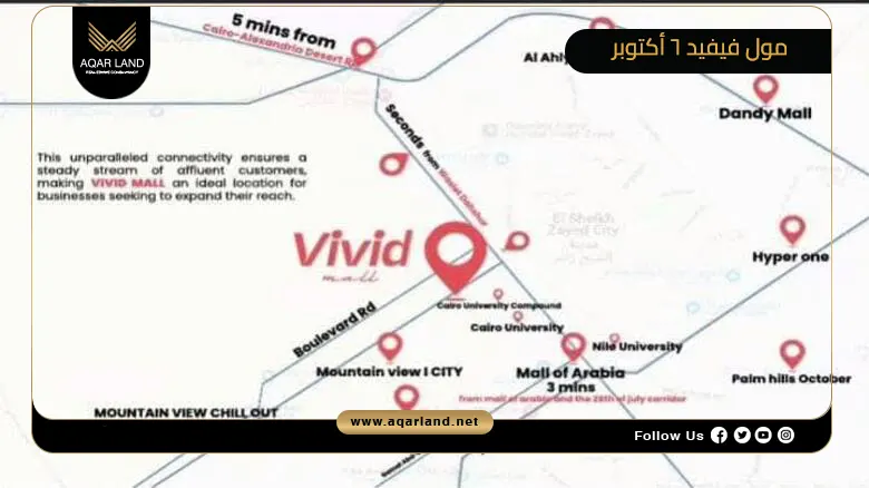 - المسافة بين مول فيفيد 6 أكتوبر وطريق مصر اسكندرية الصحراوي لا تتعدى الخمسة دقائق، ممّا يسهّل الحركة من المول وإليه.