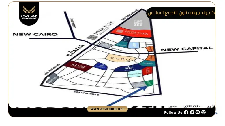 - لا يبعد مشروع جولف تاون Golf Town كثيرًا عن الكمبوندات السكنية الراقية في القاهرة الجديدة مثل: كمبوند زيد ايست التجمع السادس، وكمبوند ايفر التجمع السادس، وغيرهم من الكمبوندات.