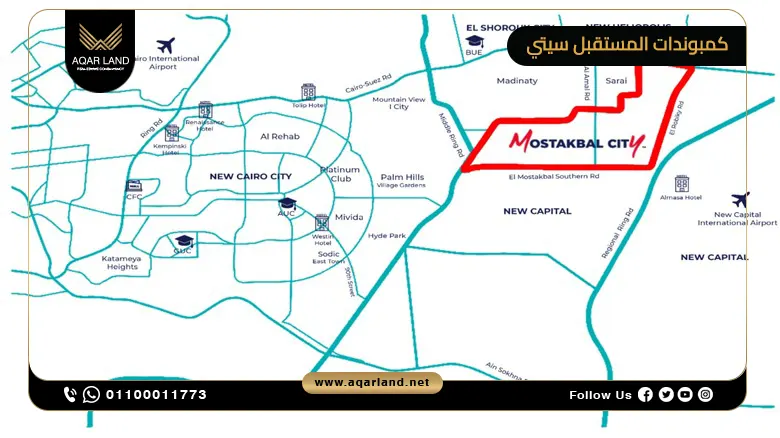تتمتع كمبوندات المستقبل سيتي Future City Compounds بموقع استراتيجي لا مثيل له، حيث تتوسط أهم مناطق القاهرة الكبرى، لتكون حلقة وصل بين التجمع الخامس، مدينة الشروق، مدينتي، والعاصمة الإدارية الجديدة، هذا الموقع المميز جعلها محاطة بشبكة متكاملة من الطرق والمحاور الرئيسية، مما يضمن سهولة الوصول إليها من أي مكان وبأقل وقت ممكن.