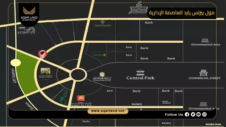 من خلال اعتماد الشركة على اختيار مواقع استثنائية لمشروعاتها، تم تشييد مول بيزنس يارد في قلب العاصمة الإدارية، بالتحديد في القطعة رقم CS-18 على محور الوزارات مباشرةً وأمام المحطة التبادلية للمونوريل؛ مما يجعل وحدتك داخل المول تطل على 3 محاور رئيسية، مما يضمن اقتنائك لمقر إداري ذو وصول يسير.